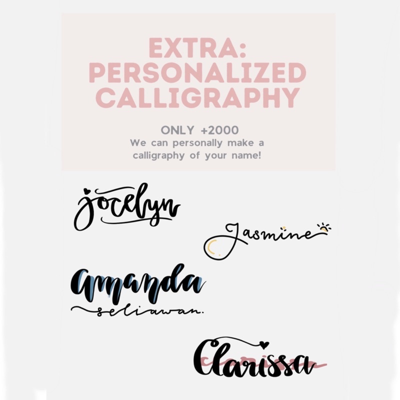 Tidak suka dengan font-font yang tersedia? Kita bisa buatkan custom calligraphy nama kalian untuk dicetak di cover. Isi keterangan pesanan dengan nama / tulisan yang ingin dibuat ya!