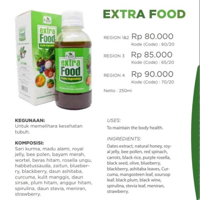 Extra Food Hpai sangat cocok untuk dijadikan sumber vitamin harian bagi anda yang memang memiliki aktifitas padat,karna kandungan nya yang kaya akan vitamin C tinggi dapat membantu menguatkan daya tahan tubuh agar tidak mudah sakit.extra food dapat dikonsumsi oleh anak anak mulai dari usia 6 bulan keatas hingga lansia
