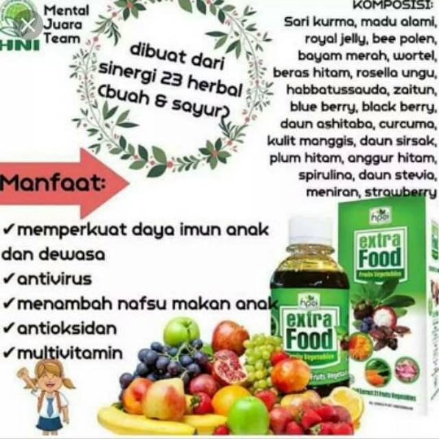 EXTRA FOOD diformulasikan sebagai makanan suplemen herba yang berkhasiat untuk mengatasi berbagai penyakit dan bermanfaat bagi kesehatan tubuh. Dengan mengkonsumsi EXTRA FOOD ini akan memberikan perlindungan Anda dan keluarga dari radikal bebas.