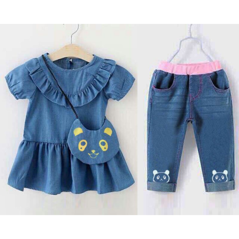 F2-ST PANDA DENIM KIDS Bahan full denim super atasan Ld70 P47 blkang ada resleting + celana pinggang spndeks ngaret Lp74 P45 + free aplikasi tas pisah dan hidup FIT TO 3-5TH tergantung anak