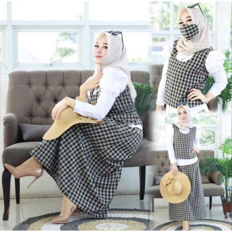 KEMEJA BAHAN MOSCREPE GOOD QUALITY KANCING DEPAN LD 106 PJG BAJU 65CM + ROMPI KOTAK ZARA + ROK BAHAN KATUN ZARA PINGGANG KARET KANTONG KANAN KIRI PJG 95cm, + Maskerfit to xL