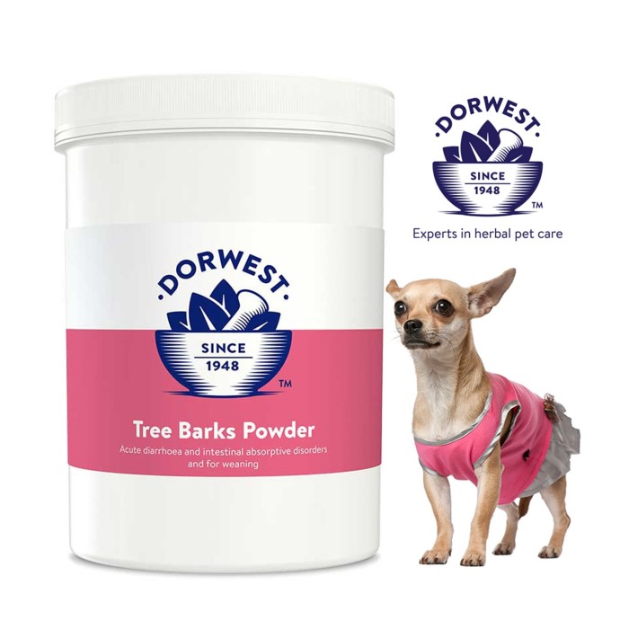 Treebark - membantu pencernaan dan penyerapan makanan dalam kasus2 dimana anjing/kucing memiliki problem utk menyerap nutrisi dari makanan, gangguan pencernaan dan membantu penyembuhan terutama pada saat (dan sesudah) diare. Menenangkan saluran pencernaan dan membantu memperlambat jalannya makanan dalam saluran pencernaan sehingga meningkatkan penyerapan nutrisi, memadatkan kotoran (poop) yang lembek dan meminimalkan problem yang biasanya disebabkan oleh gangguan pencernaan. Mengandung anti radang, penghilang sakit dan penenang yang sangat membantu pada anjing/kucing yang sedang sakit. Dapat digunakan pada puppy/kitten yg sedang weaning (beralih dari air susu induk ke makanan keras)