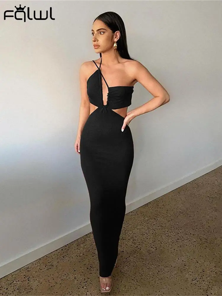 FQLWL летние Сексуальные облегающие платья для женщин 2022 Черное Красное Платье макси с лямкой на шее женское Открытое платье без рукавов
