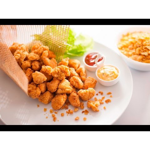 Potongan dada ayam bite sized dengan baluran tepung yang krispy.
