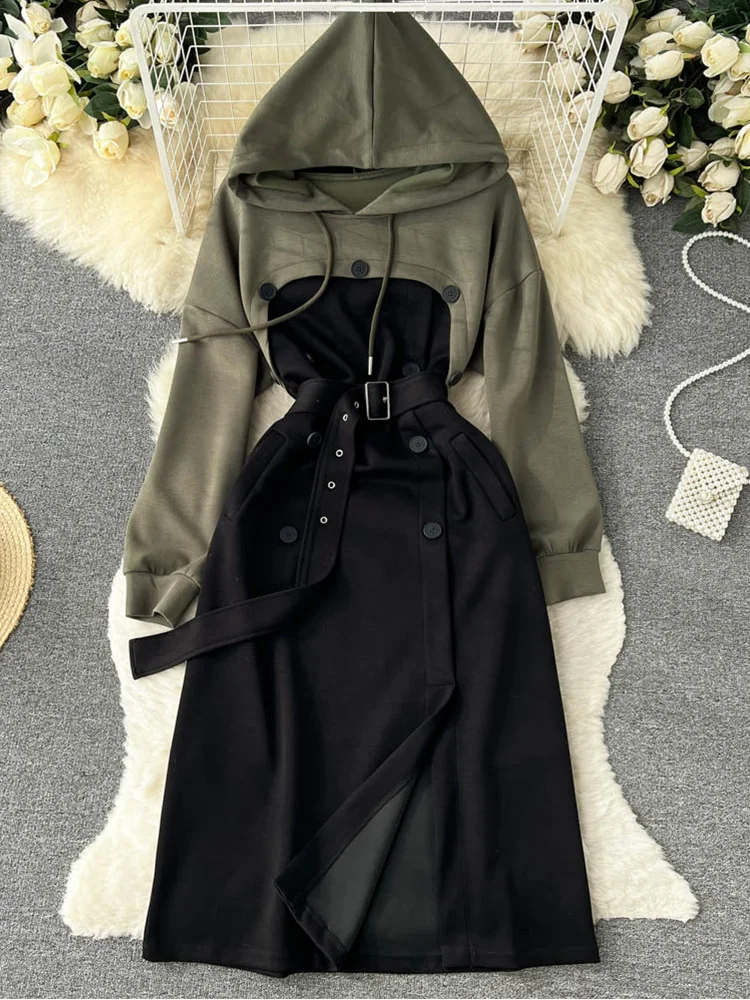 FTLZZ осенне-зимнее элегантное женское двубортное платье с капюшоном, повседневное женское платье в стиле пэчворк, сексуальное платье с разре...