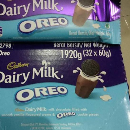 Ready Dairy Milk Cadbury Oreo ukuran 60gram exp 10/2020, coklat susu isi krim vanilla dan potongan biskuit oreo