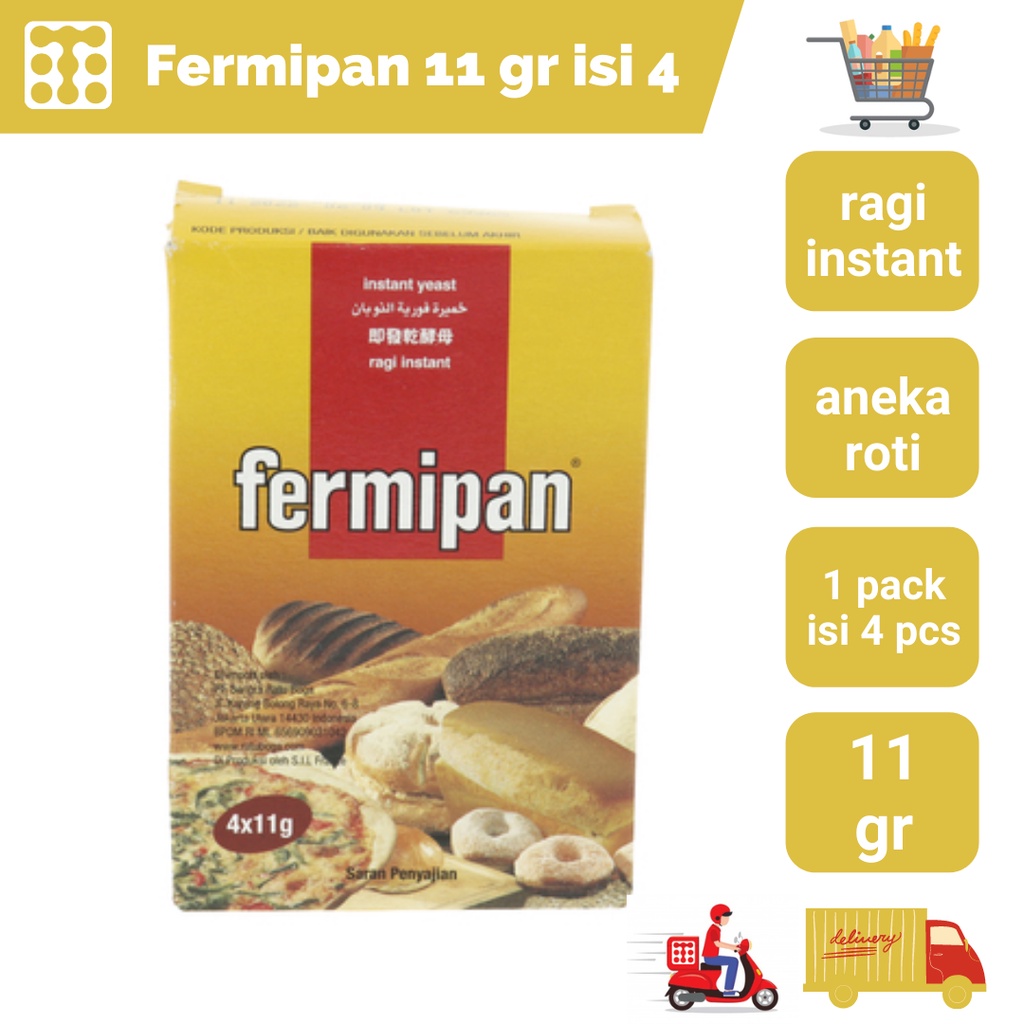 Ragi kering yang berfungsi sebagai bahan utama untuk mengembangkan roti. Ragi ini dapat mengembangkan adonan dengan menghasilkan gas CO2, memperlunak gluten dengan asam yang dihasilkan, serta memberi rasa dan aroma dari hasil pelunakan gluten. Isi 4 pcs.