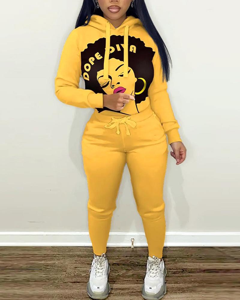 Figure Print Hooded Sweatshirt & Drawstring Pants Set, Yellow