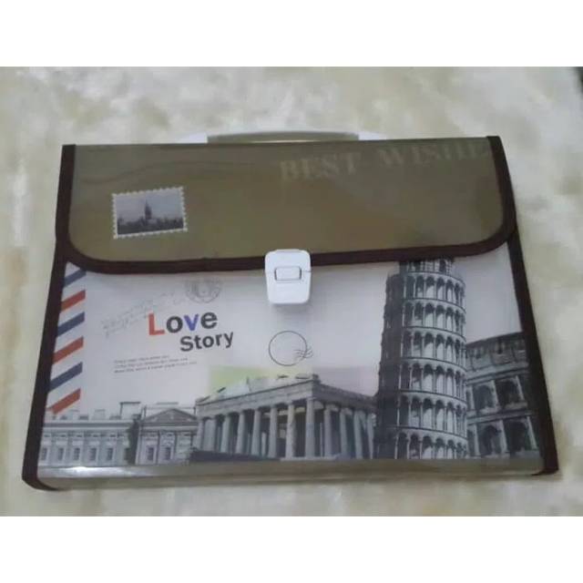 File berbentuk seperti koper & ada pegangan bagian atas sehingga mudah di bawa. Isi 11 sekat
