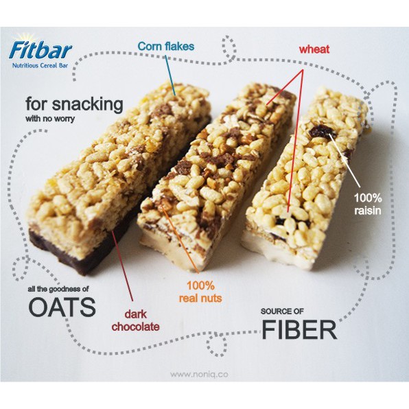 Fitbar adalah snack sehat yang menghadirkan cara mengudap sehat yang lezat, tanpa kolesterol dan lemak trans, serta rendah kalori, Snack sehat dengan oat dan rendah kalori sehingga cocok dijadikan snack diet atau selingan setiap hari.