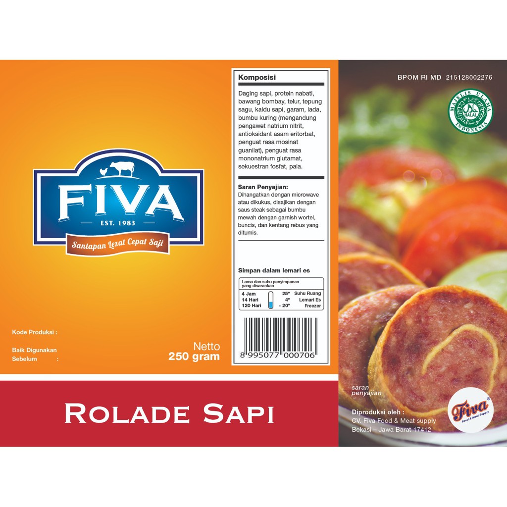Masakan spesial yang lezat ini sekarang dapat disajikan dengan mudah dan cepat dalam beberapa menit saja! Daging sapi pilihan kaya protein dipadukan dengan mantapnya racikan bumbu Fiva, digulung dengan lapisan kulit telur yang lezat sehingga menghasilkan bentuknya yang unik dan rasanya yang menggugah selera! Nikmatilah Rolade siap saji yang sehat, mudah dan enak. Dengan kemasan berukuran 250 gram yang pas untuk menyiapkan santapan keluarga, Sahabat Fiva dapat menjadikan setiap masakan sebuah sajian yang ISTIMEWA!