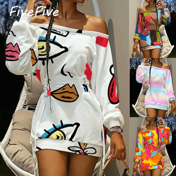 FiveFive Весняна та осіння вільна сукня з круглим вирізом і принтом із зав’язкою та довгими рукавами, шнурок на талії, який регулюється XS