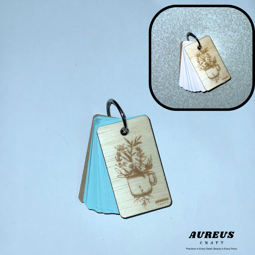 Dibuat dari kertas BC 160 gsm—dua kali lebih tebal dari HVS biasa—flash card ini menjamin ketahanan tinggi dan kenyamanan menulis tanpa tembus. Cover dari Akrilik atau kayu tebal 2 mm menjaga setiap lembar tetap rapi dan terlindungi. Selain itu, tersedia juga varian cover eksklusif berbahan akrilik dan kayu untuk tampilan lebih elegan dan premium.