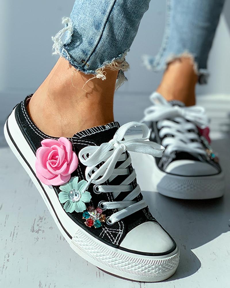Floral Pattern Rhinestone Eyelet Lace-up Skate Shoes, Black
