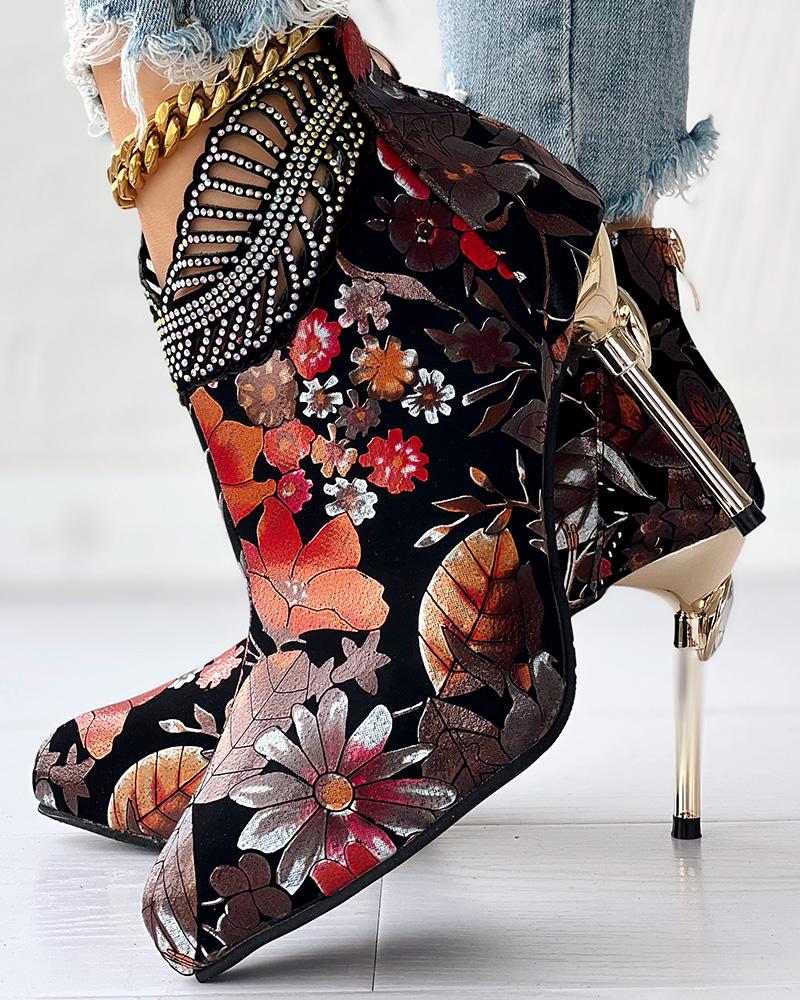 Floral Pattern Rhinestone Hollow Leaf Ankle Boots, Red