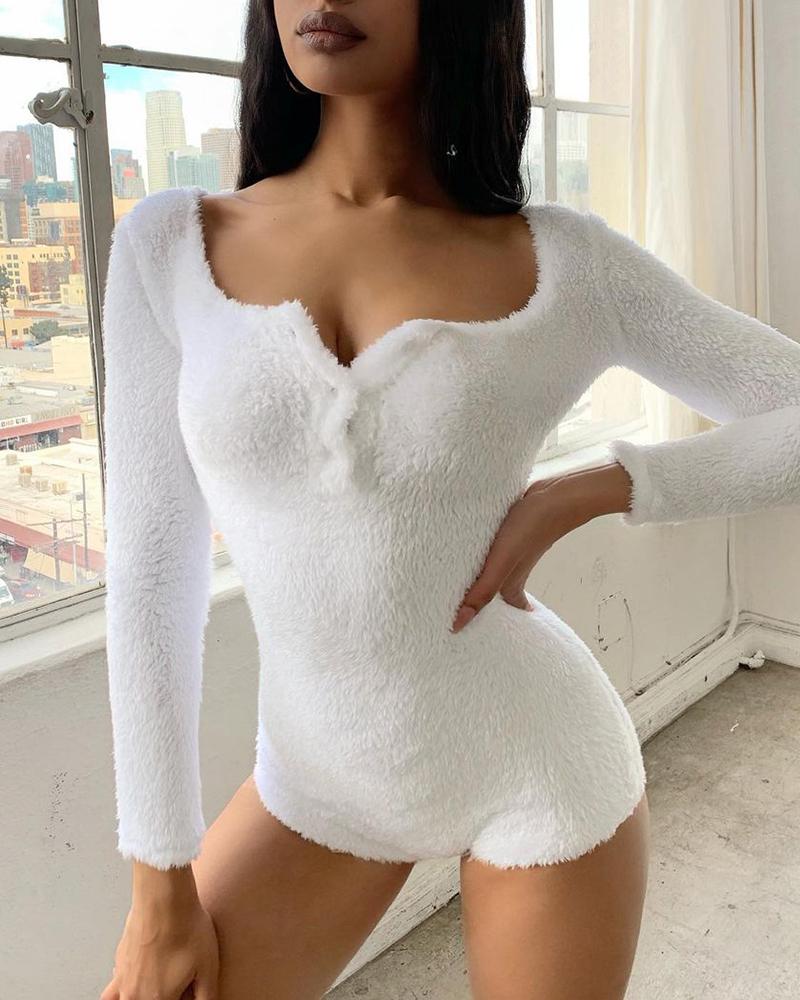 Fluffy Button Design Long Sleeve Romper, White