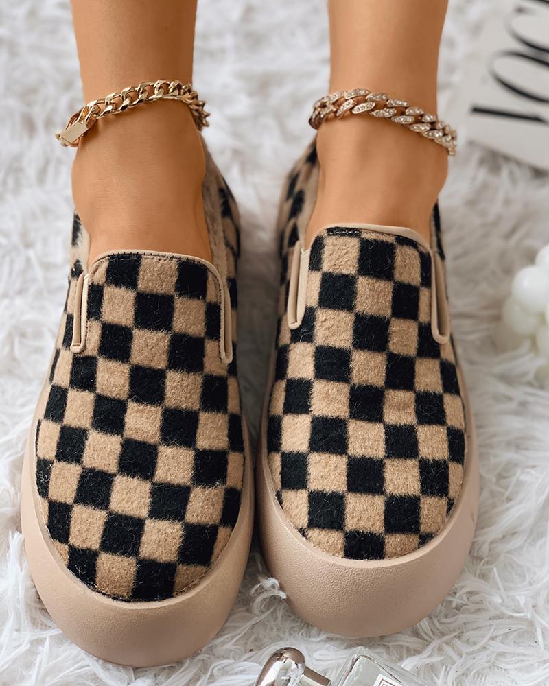 Fluffy Checkerboard Pattern Slip On Shoes, Brown
