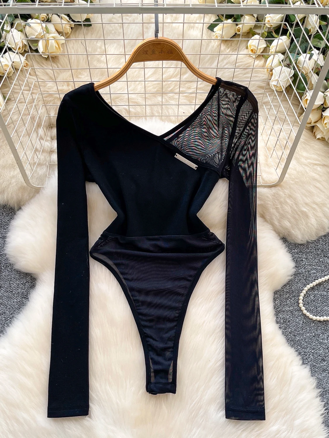 Foamlina женское сексуальное прозрачное сетчатое лоскутное боди черное с v-образным вырезом и длинными рукавами тонкие цельные топы для вечеринок в боди-клубе уличная одежда