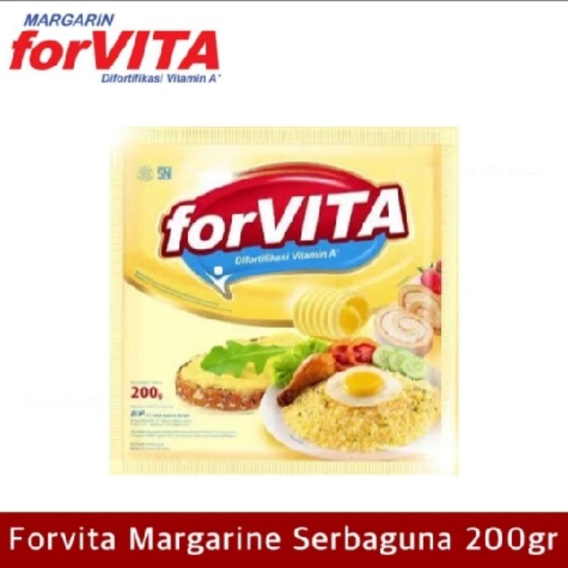 "FORVITA Margarine 200 gr merupakan margarin sehat dengan fortifikasi Vitamin A yang diolah dan diproses secara higienis untuk menghasilkan olahan masakan yang sehat dan lezat. Margarin forVITA dibuat bebas lemak trans yang adalah lemak berbahaya bagi kesehatan sehingga aman dikonsumsi dan baik bagi kesehatan. Lemak trans diketahui dapat menaikkan kadar LDL (Low Density Lipoprotein) atau kolestrol jahat yang memicu penyakit kronis seperti penyakit jantung. Selain itu, margarin FORVITA juga diperkaya kandungan Vitamin A yang membantu mengoptimalkan fungsi mata dan menjaga kesehatan mata.