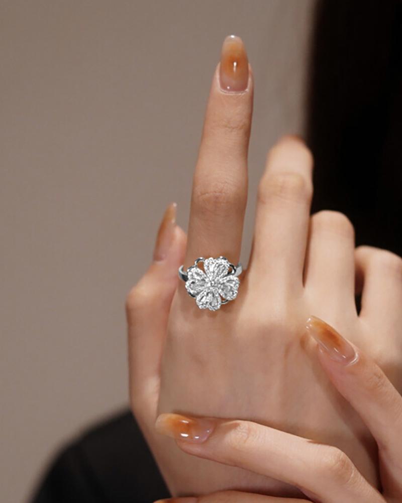 Four Leaf Clover Rhinestone Rotating Ring, Silver
