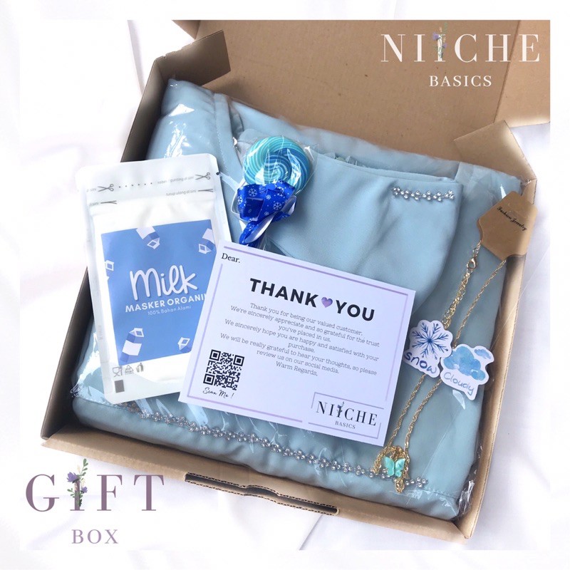 Setiap pembelian produk dress di Niiche Basics kamu akan mendapatkan satu set dengan masker, kalung butterfly, gift box dan free items lainnya ♡