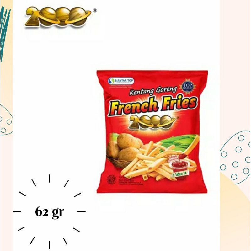 French Fries 2000 Premium 138 gr merupakan snack yang terbuat dari kentang pilihan dan diolah dengan bumbu istimewa sehingga menghasilkan snack kentang yang gurih dan renyah ditambah dengan saus sambal tomat, nikmatnya French Fries sampai ke jari-jari. Praktis dibawa kemanapun.