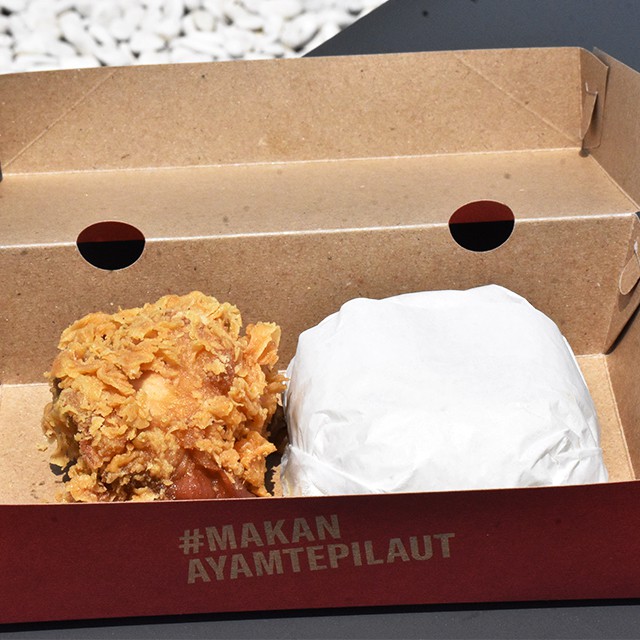 Jenis makanan Ready to Eat, menyajikan kelezatan Ayam Tepung crispy dengan rasa khas Ayam Tepi Laut, serta tambahan Nasi Putih yang melengkapi sensasi kenikmatannya.