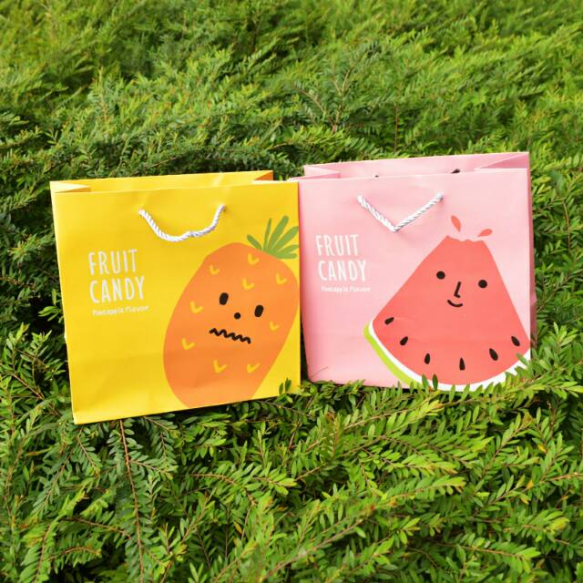 Kantong kertas (paper bag) dengan gambar buah-buahan serta memiliki 2 warna cerah yaitu pink dan kuning. Gunakan untuk memberikan bingkisan / kado atau sekedar pengganti kantong biasa. Bahan kantong terbuat dari kertas karton tebal sehingga tidak mudah koyak.