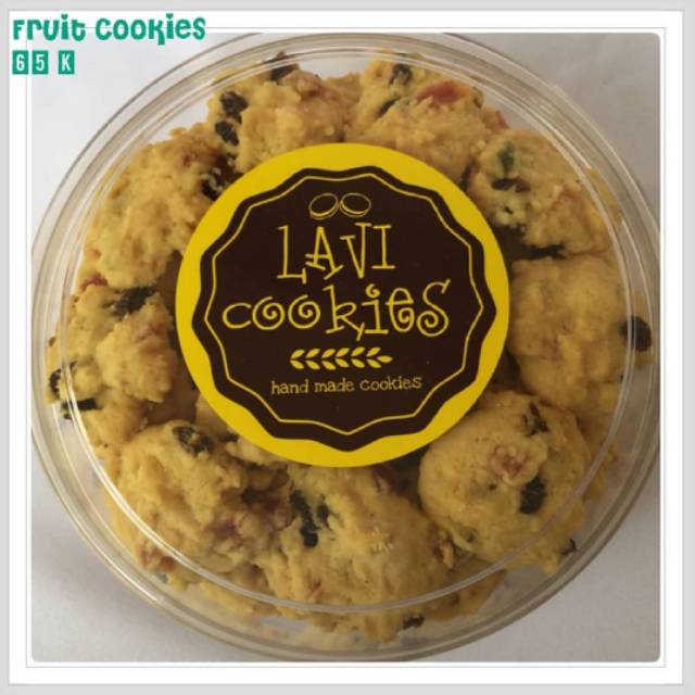 kue dengan potongan kismis, ceri merah, dan ceri hijau...