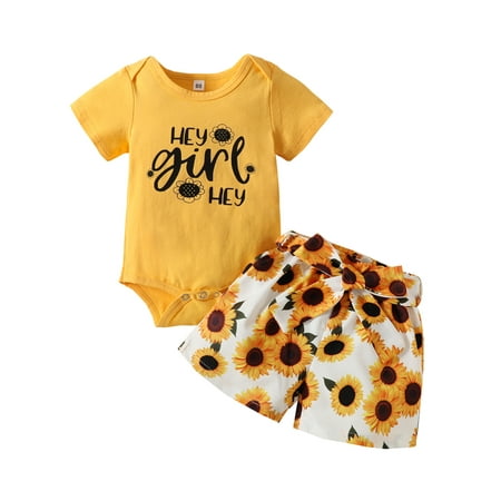 Licupiee 2PCS Newborn Baby Summer Outfits Letter Print Short Sleeve Romper+ Starfish/ Sunflower/ Striped Shorts