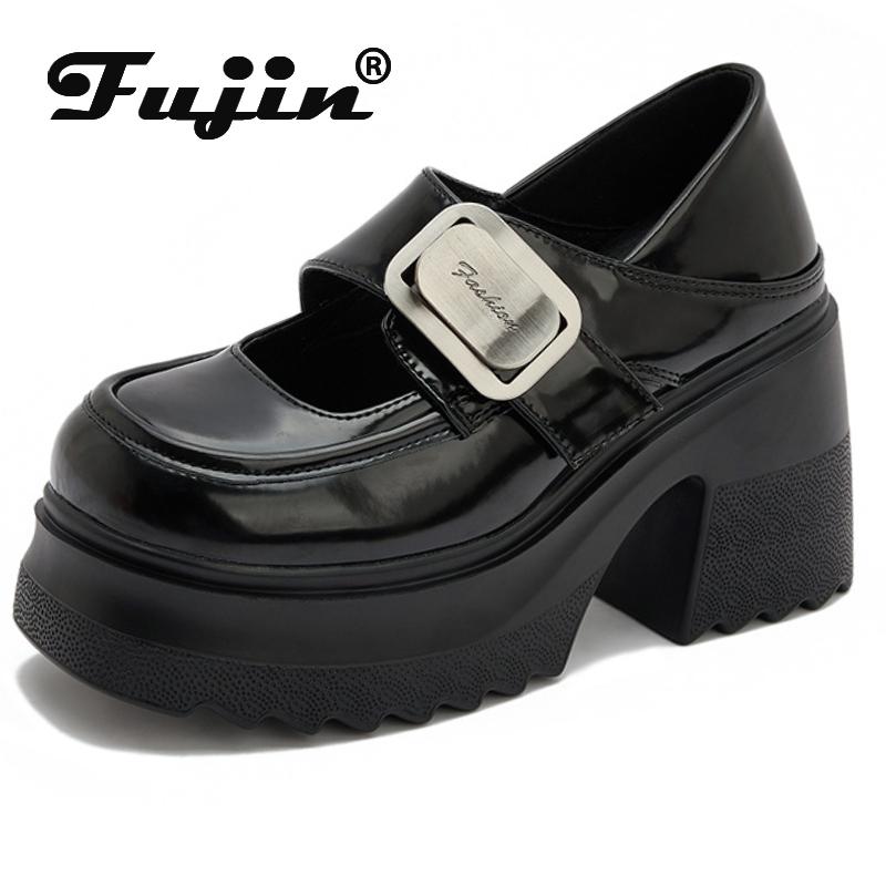 Fujin/10 см прочные ботильоны из лакированной микрофибры, женские туфли-лодочки Мэри Джейн, мотоциклетные летние туфли на платформе, на высоком каблуке