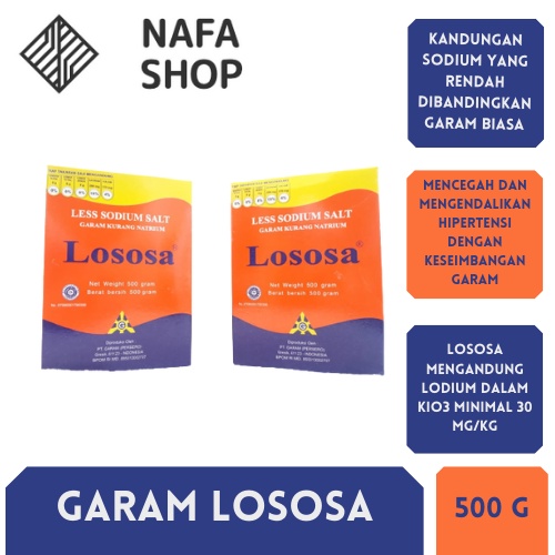 LOSOSA merupakan produk garam konsumsi PT. Garam (Persero) untuk masyarakat yang berusaha mengurangi asupan Natrium dalam konsumsi sehari-hari. Sangat bermanfaat bagi penderita hipertensi/darah tinggi karena Lososa berfungsi mengendalikan tekanan darah dan mengurangi resiko stroke.