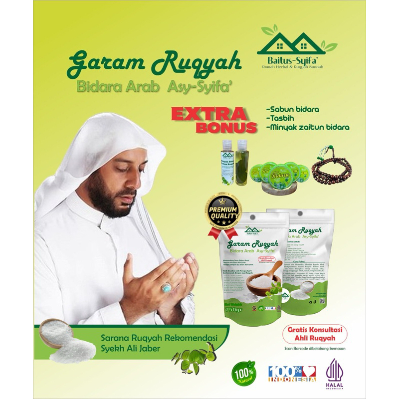 Sebelum digunakan membaca Ta'awudz dan Basmallah. Meminta kepada Allah dengan wasilah/perantara Garam Ruqyah Bidara Arab ASY-Syifa ini Allah hilangkan energi negatif, sihir, gangguan gaib yg mengganggu tubuh, rumah, tempat usaha,dll.