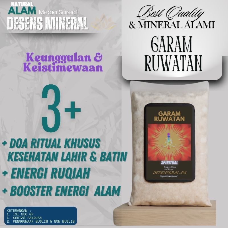 Garam Ruwatan adalah garam alami berkualitas tinggi yang telah diproses secara tradisional dengan sentuhan spiritual untuk memberikan manfaat luar biasa bagi kesehatan fisik dan batin. Garam ini telah melewati serangkaian doa ritual khusus, energi ruqiah, dan diberikan booster energi alam untuk meningkatkan khasiatnya. Produk ini juga bertujuan untuk membantu tercapainya maksud, tujuan, dan hajat khusus yang diinginkan oleh penggunanya.
