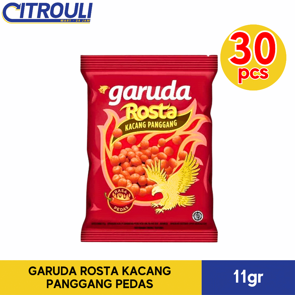 Garuda Rosta adalah kacang salut yang dipanggang tidak digoreng, memberikan rasa yang enak dan renyah untuk dinikmati. Enanknya Garuda Rosta, sekali coba nggak bisa berhenti sehingga cocok dinikmati saat kumpul bersama keluarga dan teman. Komposisi : Kacang Tanah, Tepung Terigu, Pati Jagung, Gula, Saus Cabe 4,9% (mengandung Cabe 40%, Penguat Rasa Mononatrium Glutamat, Pemanis Alami Glikosida Steviol, Pengawet (Kalium Sorbat dan Natrium Benzoat)), Bumbu Rasa Balado 3,6% ( Mengandung Bubuk Cabe 0,2%, Pemanis Alami Glikosida Steviol), Pengembang Bawang Putih, Garam, Penguat Rasa Dinatrium inosinat dan Guanilat.