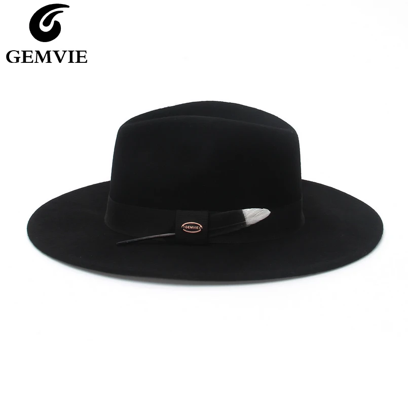 GEMVIE новая шерстяная фетровая Федора с широкими полями для мужчин полосатая лента с перьями осенне-зимняя Панама джазовая шапка для женщин