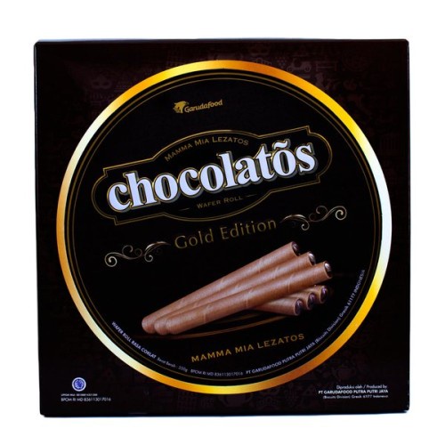 wafer stik yang lebih besar dan panjang, yang dipadu dengan krim coklat yang padat. Tersedia dalam kemasan platinum yang eksklusif. “Chocolatos, Mamma Mia Lezatos”.