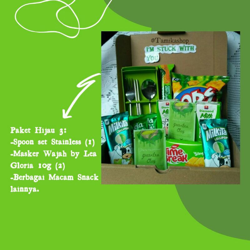 Hai guys buat kalian yang bingung cari kado untuk pacar, pasangan, selingkuhan, teman, keluarga, sahabat. Kini tersedia di toko kami ada Snack box / Gift box spesial Green set premium