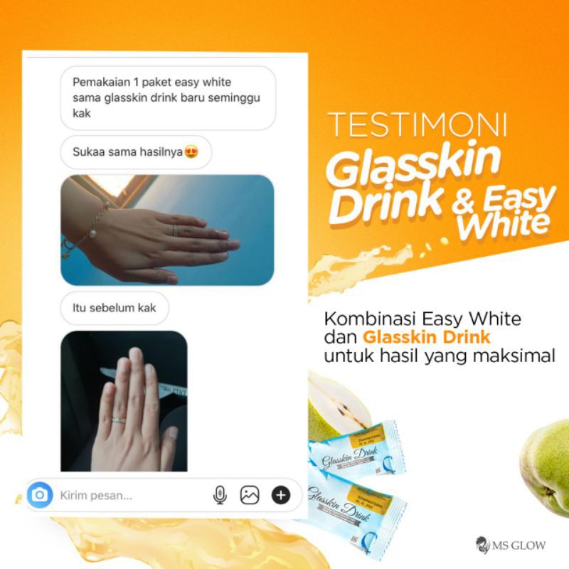 Makanya biar penampilanmu semakin sempurna dan glowing, kamu butuh minum Glasskin Drink 1x setiap hari Kandungan Salmon Collagen dan L-Glutathionenya bantu kamu buat pudarkan flek hitam dan jaga kesehatan kulitmu dari dalam. Ngga cuma itu, Glasskin Drink juga bisa bantu perkuat rambut dan kukumu biar ikutan glowing juga seperti kulitmu ✨