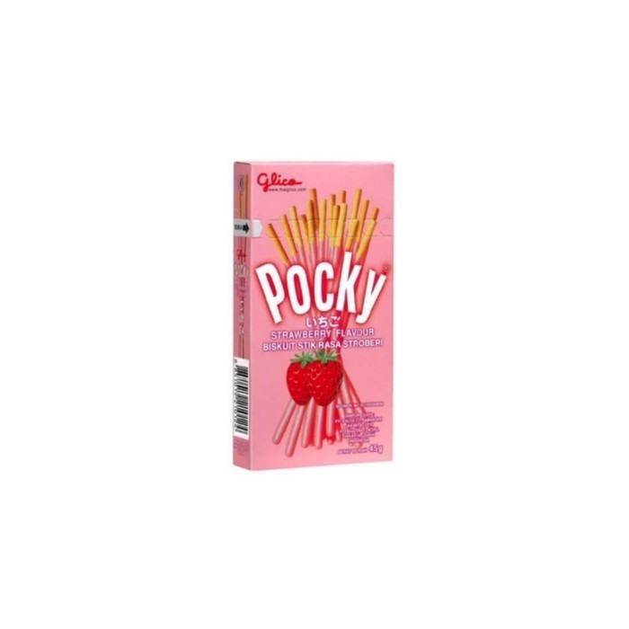 Glico Pocky adalah camilan stik biskuit yang dilapisi dengan krim. Varian ini memiliki rasa stroberi dan tersedia dalam kemasan 45gram. Produk ini populer karena kombinasi biskuit renyah dengan Krim rasa stroberi yang manis dan segar melapisi stik biskuit, memberikan rasa yang lezat dan memanjakan lidah.
