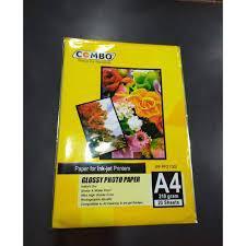 Glossy Photo Paper merupakan kertas photo berukuran A4 dengan ketebalan 210gr , dan 230 kertas dengan permukaan cetak yg mengkilap ini sangat sering di gunakan untuk mencetak gambar , karna hasil cetaknya yang bagus dan tajam.