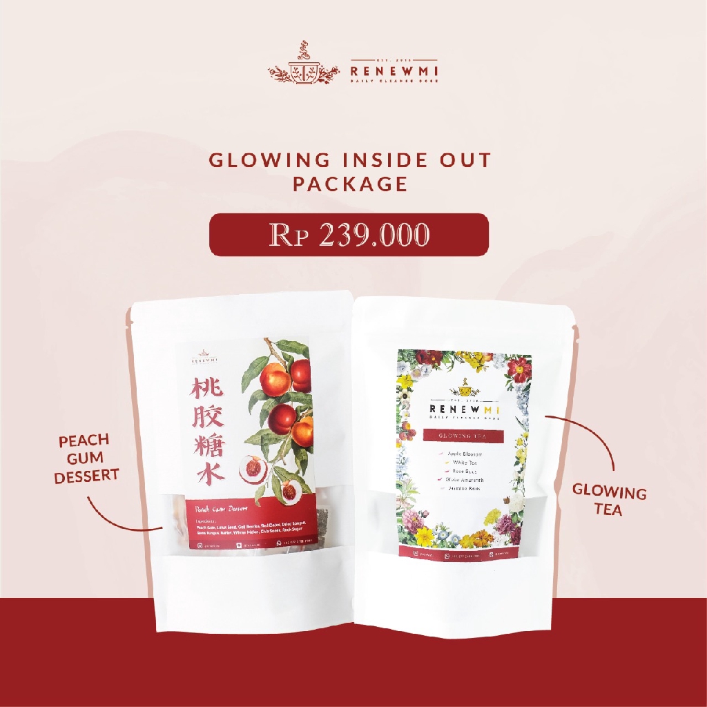 Glowing Inside Out Package hadir dengan 2 produk andalan dari renewmi yang dapat menyehatkan kulit kamu yaitu Glowing Tea dan Peach Gum Dessert! ✨ dengan mengkonsumsi Peach Gum Dessert dan Glowing Tea secara bersamaan kamu akan mendapatkan hasil yang lebih maksimal untuk kesehatan dan kecantikan kulitmu