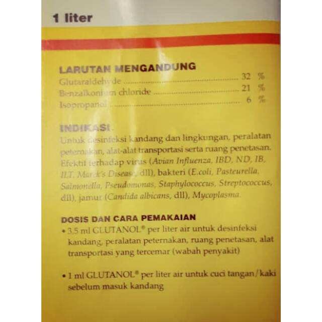 Untuk sebagai desinfektan : 3.5 ml Glutanol per liter air di encerkan dan bisa di semprotkan atau spraying dll