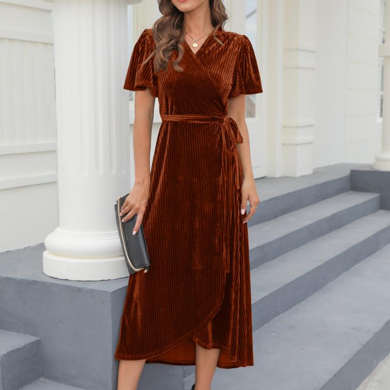 GMXIA Большие размеры женские платья средней длины из шелка и бархата с разрезом и завязками в полоску на осень и зиму XXXL каштановый