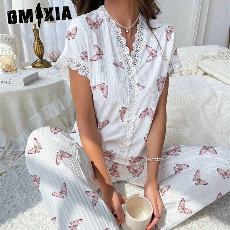 GMXIA Домашняя одежда Пижама с принтом с коротким рукавом Женский комплект из двух предметов, который можно носить на улице, Длинные брюки M детские розовый/белый