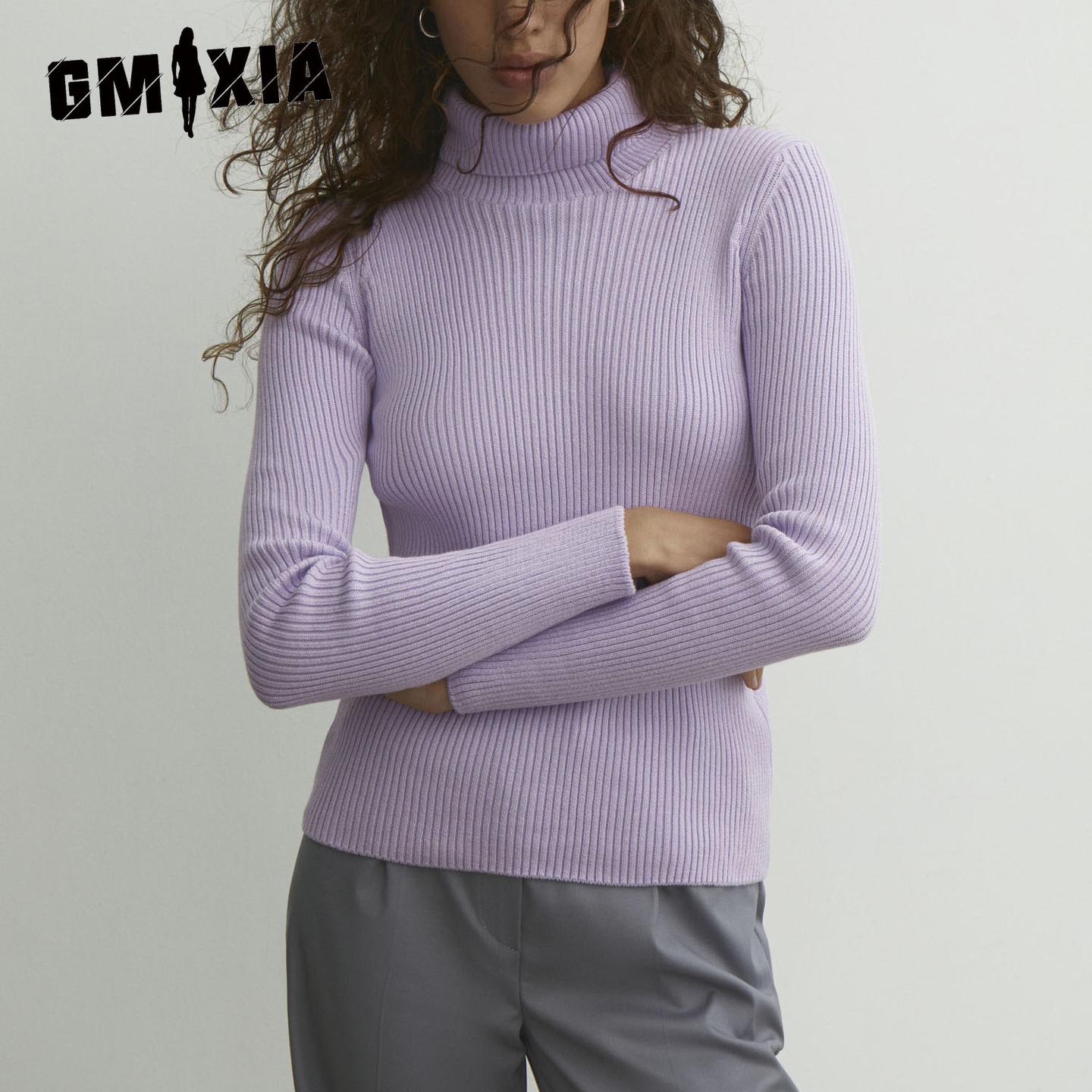 GMXIA Женский удлиненный свитер с высоким воротом, осенне-зимняя вязаная нижняя рубашка, тонкий пуловер с высоким воротом, свитер XL/XXL светло-фиолетовый