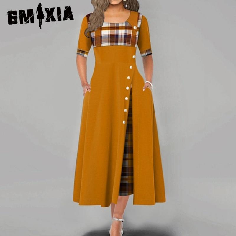 GMXIA Женское Модное Повседневное Необычное Платье Макси с Принтом Клетки на Пуговицах, с Коротким Рукавом и Круглым Вырезом, Большого Размера, для Вечеринки XXL жёлтый