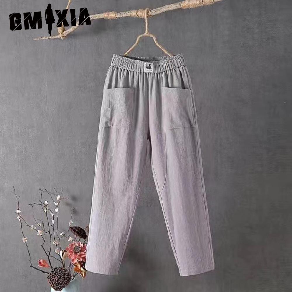 GMXIA Летние женские брюки Повседневные хлопково-льняные брюки Свободные прямые брюки Брюки гаремы длиной девять точек XXXXXL серый