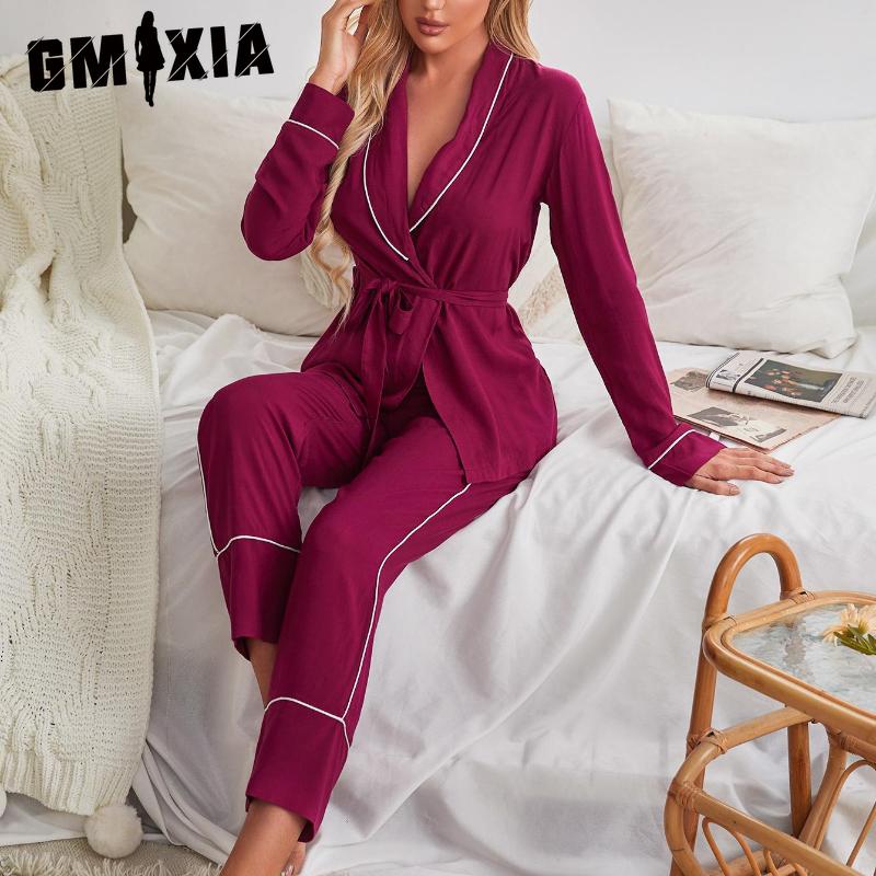 GMXIA Пижама Женская Осень и Зима Красный Халат с Длинным Рукавом Брюки Домашняя Одежда из Двух Предметов XL малиновый