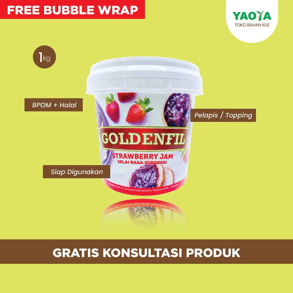 Goldenfil Strawberry Jam 1kg( 50% Buah asli) selai strawberry. Tahan panggang hingga 200 derajat celcius (tetap lembut setelah panggang, tidak kaku keras). Cocok untuk digunakan sebagai isian roti, kue kering, campuran minuman yoghurt, smoothies.